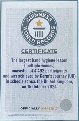 The school took part in the largest hand hygiene lesson (multiple venue) organised by Germ's Journey UK on 15th October 2024. We are pleased to say that this lesson achieved a new world record of which we are very proud